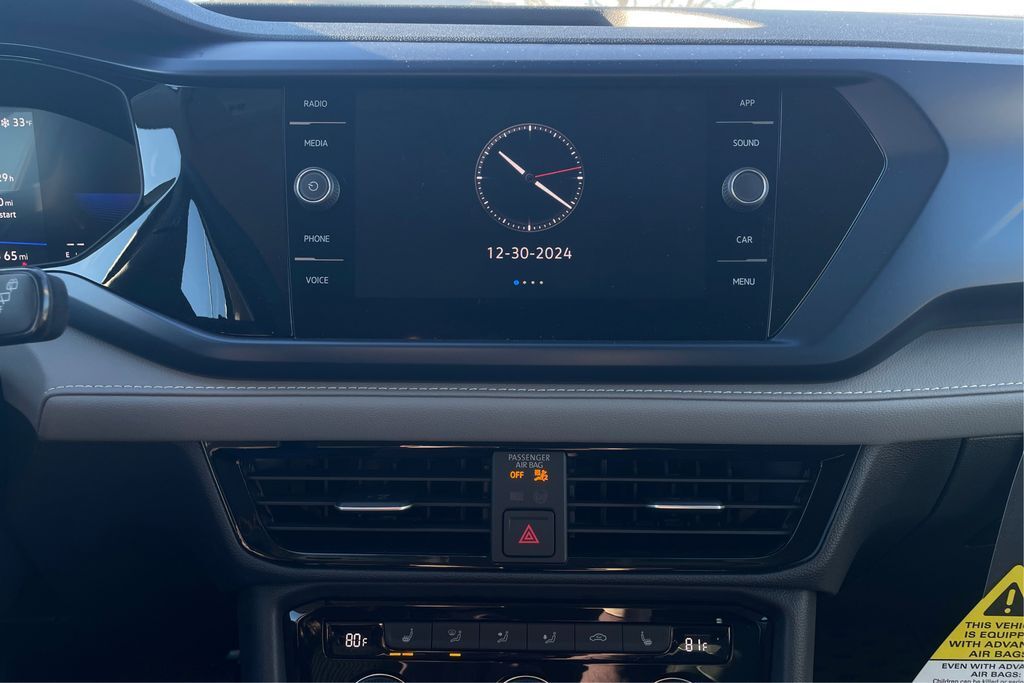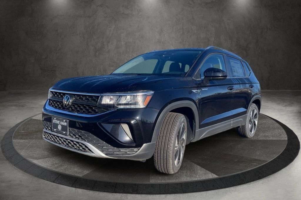 Deep Black 2024 Volkswagen Taos 1.5T SE 1.5L I4 Turbocharged DOHC 16V LEV3-SULEV30 158hp 7-Speed DSG Automatic with Tiptronic AWD 4D Sport Utility 4-Wheel Disc Brakes, 5.20 Axle Ratio, 6 Speakers, ABS brakes, Active Blind Spot Monitor, Air Conditioning, Alloy wheels, AM/FM radio: SiriusXM with 360L, Auto High-beam Headlights, Automatic temperature control, Brake assist, Bumpers: body-color, CloudTex & Cloth Seating Surfaces, Compass, Delay-off headlights, Driver door bin, Driver vanity mirror, Dual front impact airbags, Dual front side impact airbags, Electronic Stability Control, Emergency communication system: VW Car-Net Safe & Secure 5-year, Exterior Parking Camera Rear, Four wheel independent suspension, Front anti-roll bar, Front Bucket Seats, Front Center Armrest, Front dual zone A/C, Front reading lights, Front Strut Rear Multi-Link Suspension, Fully automatic headlights, Heated door mirrors, Heated Front Bucket Seats, Heated front seats, Heated steering wheel, Illuminated entry, Leather Shift Knob, Low tire pressure warning, Occupant sensing airbag, Outside temperature display, Overhead airbag, Overhead console, Panic alarm, Passenger door bin, Passenger vanity mirror, Power door mirrors, Power driver seat, Power steering, Power windows, Radio data system, Radio: MIB3 Composition Media AM/FM/HD, Rain sensing wipers, Rear anti-roll bar, Rear seat center armrest, Rear window defroster, Rear window wiper, Remote keyless entry, Security system, Speed control, Speed-sensing steering, Split folding rear seat, Spoiler, Steering wheel mounted audio controls, Tachometer, Telescoping steering wheel, Tilt steering wheel, Traction control, Trip computer, Variably intermittent wipers, Wheels: 18" 2-Tone Machined Alloy.