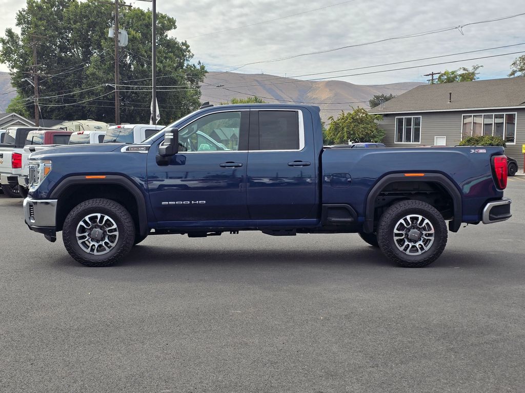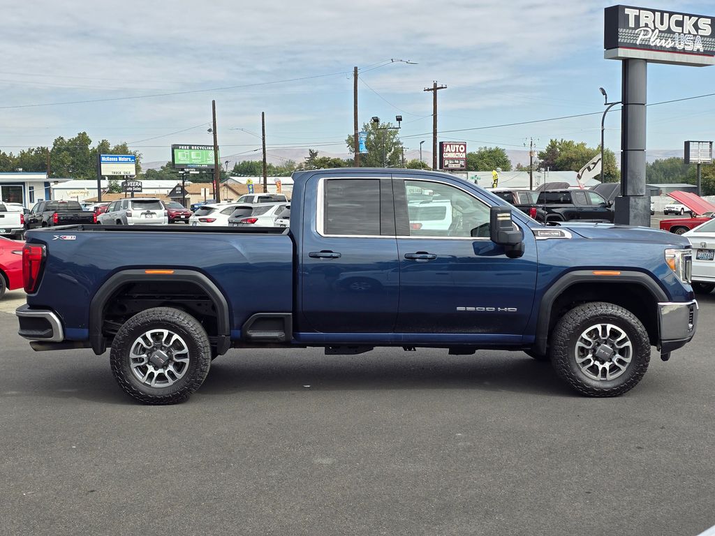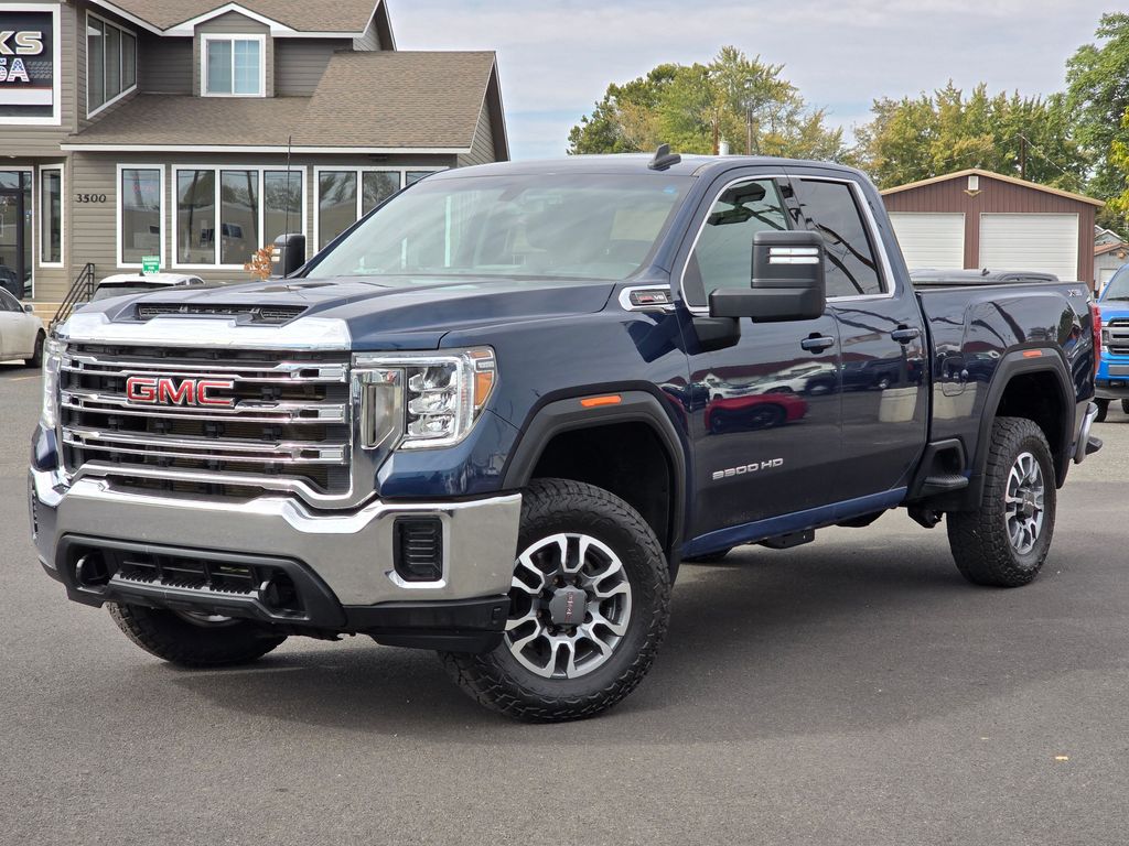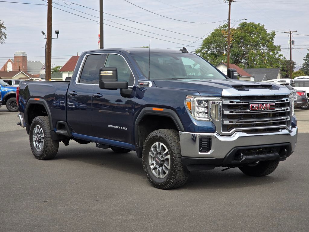 Clean CARFAX. Blue 2022 GMC Sierra 2500HD SLE 6.6L V8 6-Speed Automatic 4WD Double Cab 6-Speed Automatic, 4WD, Cloth, 17" Machined Aluminum Wheels, 2-Speed Electronic Shift Transfer Case, 3.73 Rear Axle Ratio, 4-Way Manual Driver Seat Adjuster, 4-Way Manual Passenger Seat Adjuster, 4-Wheel Disc Brakes, 6 Speakers, 6-Speaker Audio System Feature, ABS brakes, Air Conditioning, Alloy wheels, AM/FM radio: SiriusXM, Apple CarPlay/Android Auto, Brake assist, Bumpers: chrome, Chrome Surround Grille w/High Gloss Black Mesh, Cloth Seat Trim, Compass, Compass Located In Instrument Cluster, Deep-Tinted Glass, Delay-off headlights, Driver door bin, Driver vanity mirror, Dual front impact airbags, Dual front side impact airbags, Electronic Stability Control, Emergency communication system: OnStar and GMC Connected Services capable, Front 40/20/40 Split-Bench Seats, Front anti-roll bar, Front Center Armrest w/Storage, Front reading lights, Front wheel independent suspension, Fully automatic headlights, GMC Connected Access Capable, Heated door mirrors, Heavy-Duty 80 Amp Battery, Illuminated entry, Integrated Trailer Brake Controller, Low tire pressure warning, Manual Tilt Wheel Steering Column, Occupant sensing airbag, OnStar & GMC Connected Services Capable, Outside temperature display, Overhead airbag, Overhead console, Panic alarm, Passenger door bin, Passenger vanity mirror, Pickup Box, Power Door Locks, Power door mirrors, Power Front Windows w/Passenger Express Down, Power Rear Windows w/Express Down, Power steering, Power windows, Power Windows w/Driver Express Up/Down, Premium audio system: GMC Infotainment System, Radio: AM/FM w/GMC Infotainment System, Rear reading lights, Rear step bumper, Remote Keyless Entry, Remote keyless entry, SiriusXM Radio, Speed control, Split folding rear seat, Steering Wheel Audio Controls, Steering wheel mounted audio controls, Suspension Package, Tachometer, Tilt steering wheel, Traction control, Trip computer, Turn signal indicator mirrors, Variably intermittent wipers, Voltmeter, Wi-Fi Hotspot Capable, 6-Speed Automatic, 4WD, Cloth.
