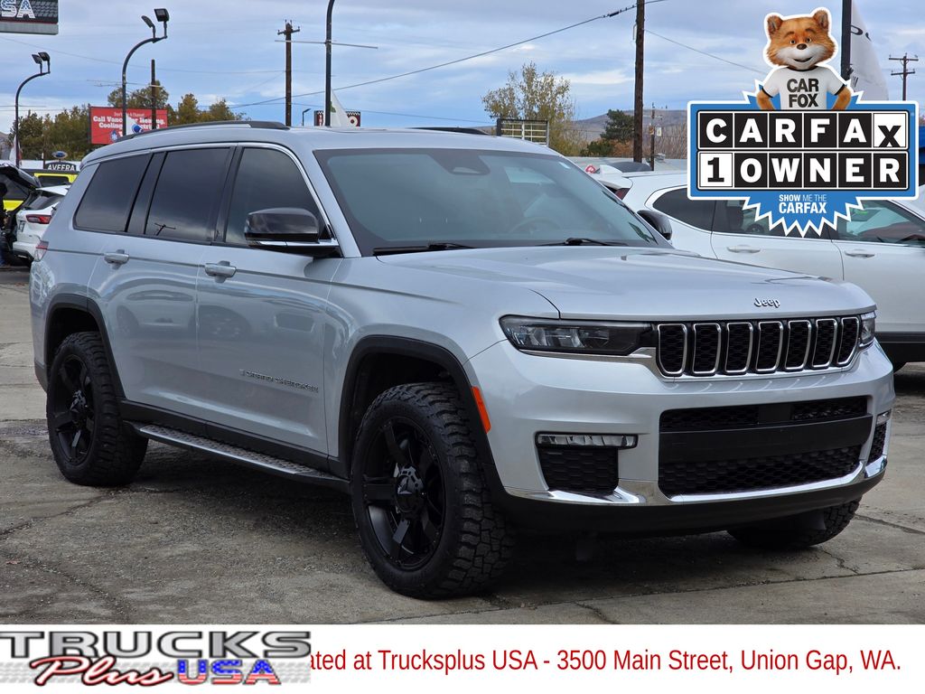 Recent Arrival! Clean CARFAX. Silver Zynith 2021 Jeep Grand Cherokee L Limited 3.6L V6 24V VVT 8-Speed Automatic 4WD 4D Sport Utility 10.1" Touchscreen Display, 220 Amp Alternator, 3.45 Rear Axle Ratio, 3rd row seats: split-bench, 4-Wheel Disc Brakes, 506 Watt Amplifier, 6 Speakers, 9 Amplified Speakers w/Subwoofer, ABS brakes, Air Conditioning, Alloy wheels, AM/FM radio: SiriusXM w/360L, Anti-whiplash front head restraints, Apple CarPlay, Apple CarPlay/Android Auto, Audio memory, Auto High-beam Headlights, Automatic Headlamp Leveling System, Automatic temperature control, Brake assist, Bridgestone Brand Tires, Bumpers: body-color, Capri Leather Seats, Compass, Connected Travel & Traffic Services, Connectivity - US/Canada, Delay-off headlights, Disassociated Touchscreen Display, Driver door bin, Driver vanity mirror, Dual front impact airbags, Dual front side impact airbags, Dual-Pane Panoramic Sunroof, Electronic Stability Control, Emergency communication system, Four wheel independent suspension, Front anti-roll bar, Front Bucket Seats, Front Center Armrest w/Storage, Front dual zone A/C, Front fog lights, Front reading lights, Fully automatic headlights, Garage door transmitter, Google Android Auto, GPS Antenna Input, GPS Navigation, HD Radio, Heated door mirrors, Heated front seats, Heated rear seats, Heated steering wheel, Heavy-Duty Engine Cooling, Illuminated entry, Integrated Center Stack Radio, Integrated Voice Command w/Bluetooth, Interior Rear Facing Camera, Knee airbag, Leather steering wheel, Low tire pressure warning, Manual Fold Seatbacks, Memory seat, MOPAR Bright Side Steps, Normal Duty Suspension, Occupant sensing airbag, Outside temperature display, Overhead airbag, Overhead console, Panic alarm, ParkView Rear Back-Up Camera, Passenger door bin, Passenger vanity mirror, Power door mirrors, Power driver seat, Power Liftgate, Power passenger seat, Power steering, Power windows, Quick Order Package 22E, Radio data system, Radio: Uconnect 5 Nav w/10.1" Display, Radio: Uconnect 5 w/8.4" Display, Rear air conditioning, Rear anti-roll bar, Rear Load Leveling Suspension, Rear reading lights, Rear window defroster, Rear window wiper, Reclining 3rd row seat, Remote keyless entry, Roof rack: rails only, Security system, SiriusXM Satellite Radio, SiriusXM w/360L, Speed control, Speed-Sensitive Wipers, Split folding rear seat, Spoiler, Steering wheel mounted audio controls, Tachometer, Telescoping steering wheel, Tilt steering wheel, Traction control, Trailer Hitch Zoom, Trailer Tow Group (B) (DISC), Trip computer, Turn signal indicator mirrors, USB Host Flip, Variably intermittent wipers, Voltmeter, Wheels: 18" x 8.0" Fully Painted Aluminum 2, Wheels: 20" x 8.5" Polished/Painted Aluminum (DISC).