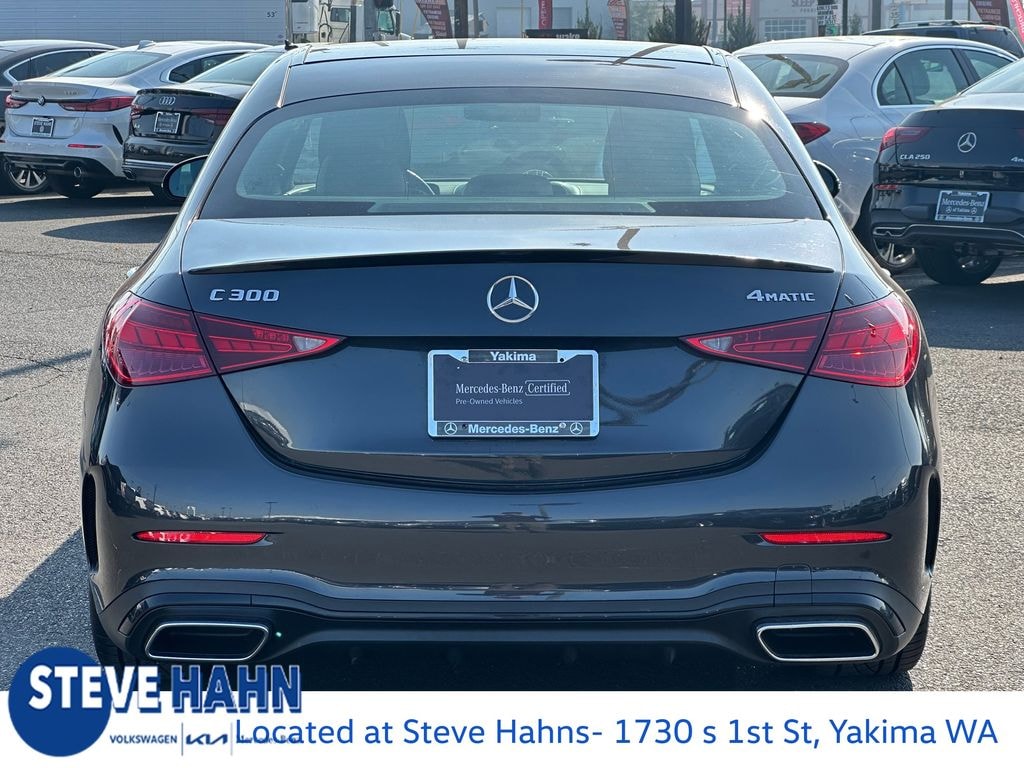 Clean CARFAX. Black 2023 Mercedes-Benz C-Class C 300 4MATIC® 2.0L I4 Turbocharged 9-Speed Automatic 4MATIC® 4D Sedan 4MATIC®, 11.9" Center Touchscreen Display, 18" 5-Spoke Wheels, 4-way Power Driver's Lumbar Support, 4-Wheel Disc Brakes, 5 Speakers, ABS brakes, Air Conditioning, Alloy wheels, AM/FM radio, Anti-whiplash front head restraints, Apple CarPlay®/Android Auto®, Auto High-beam Headlights, Auto tilt-away steering wheel, Auto-dimming door mirrors, Auto-dimming Rear-View mirror, Automatic temperature control, Brake assist, Bumpers: body-color, Child-Seat-Sensing Airbag, Compass, Delay-off headlights, Driver door bin, Driver vanity mirror, Dual front impact airbags, Dual front side impact airbags, Electronic Stability Control, Emergency communication system: Mercedes-Benz Emergency Call Service, Exterior Parking Camera Rear, Four wheel independent suspension, Front anti-roll bar, Front Bucket Seats, Front Center Armrest, Front dual zone A/C, Front reading lights, Fully automatic headlights, Garage door transmitter: HomeLink, Genuine wood dashboard insert, Head restraints memory, Heated door mirrors, Heated front seats, Illuminated entry, Knee airbag, Low tire pressure warning, MB-Tex Upholstery, Memory seat, Occupant sensing airbag, Outside temperature display, Overhead airbag, Overhead console, Panic alarm, Passenger door bin, Passenger vanity mirror, Power adjustable front head restraints, Power door mirrors, Power driver seat, Power Heated Front Seats w/Memory, Power moonroof, Power passenger seat, Power steering, Power windows, Premium audio system: MBUX, Premium Trim Package, Radio data system, Radio: FrontBass 5-Speaker Audio System, Rain sensing wipers, Rear anti-roll bar, Rear fog lights, Rear reading lights, Rear seat center armrest, Rear window defroster, Remote keyless entry, Security system, Speed control, Speed-sensing steering, Split folding rear seat, Steering wheel memory, Steering wheel mounted audio controls, Tachometer, Telescoping steering wheel, Tilt steering wheel, Traction control, Trip computer, Turn signal indicator mirrors, Variably intermittent wipers, Weather band radio, 4MATIC®.
