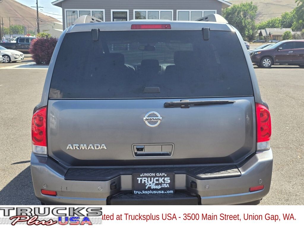 Clean CARFAX. Gun Metallic 2015 Nissan Armada SV 5.6L 8-Cylinder SMPI DOHC 5-Speed Automatic with Overdrive 4WD 4D Sport Utility 4WD, 12 Speakers, 3rd row seats: split-bench, 4-Wheel Disc Brakes, ABS brakes, Adjustable pedals, Air Conditioning, Alloy wheels, AM/FM radio: SiriusXM, Anti-whiplash front head restraints, Auto-dimming Rear-View mirror, Automatic temperature control, Bodyside moldings, Brake assist, Bumpers: body-color, CD player, Compass, Delay-off headlights, Driver door bin, Driver vanity mirror, Driver's Seat Mounted Armrest, Dual front impact airbags, Dual front side impact airbags, Electronic Stability Control, Four wheel independent suspension, Front anti-roll bar, Front Bucket Seats, Front Center Armrest, Front dual zone A/C, Front fog lights, Front reading lights, Fully automatic headlights, Garage door transmitter: HomeLink, Heated door mirrors, Illuminated entry, Leather Shift Knob, Low tire pressure warning, Occupant sensing airbag, Outside temperature display, Overhead airbag, Overhead console, Panic alarm, Passenger door bin, Passenger seat mounted armrest, Passenger vanity mirror, Power door mirrors, Power driver seat, Power Liftgate, Power passenger seat, Power steering, Power windows, Radio data system, Rear air conditioning, Rear anti-roll bar, Rear Parking Sensors, Rear reading lights, Rear seat center armrest, Rear window defroster, Rear window wiper, Reclining 3rd row seat, Remote keyless entry, Security system, Speed control, Speed-sensing steering, Speed-Sensitive Wipers, Split folding rear seat, Steering wheel mounted audio controls, Tachometer, Tilt steering wheel, Traction control, Trip computer, Variably intermittent wipers, Voltmeter, 4WD.
