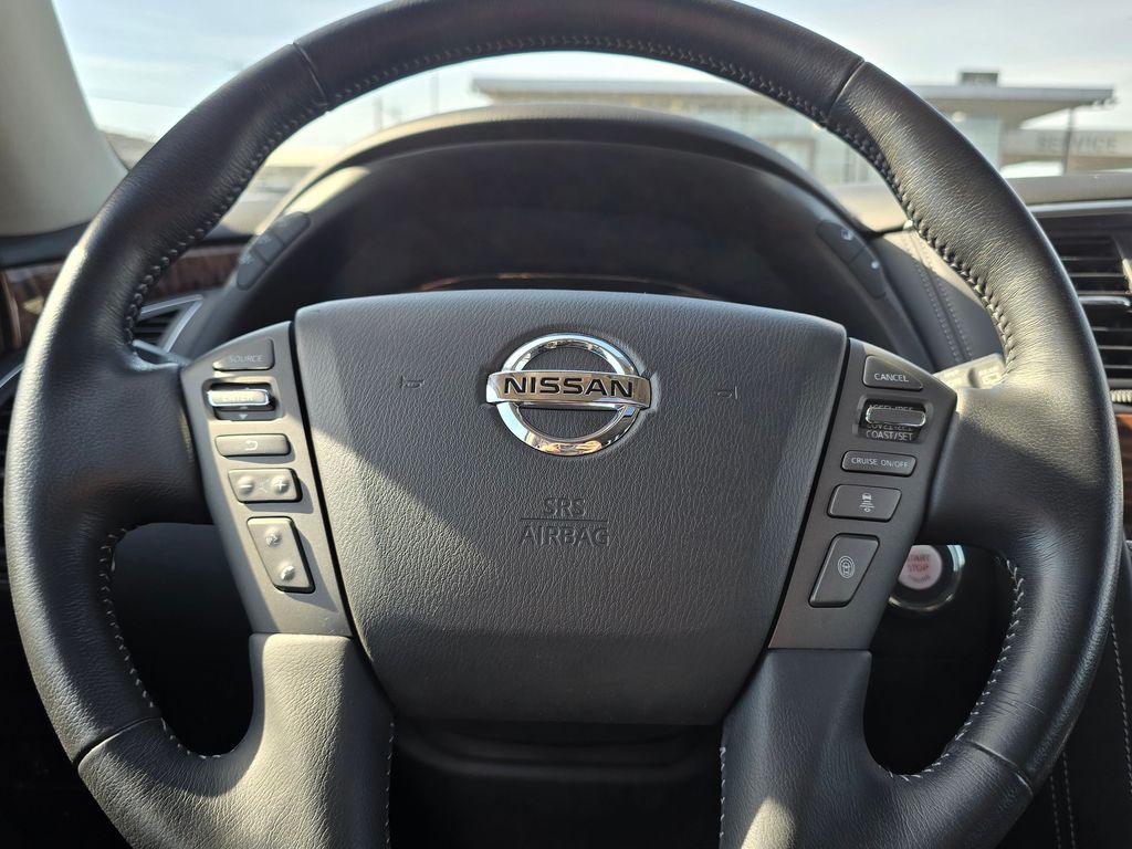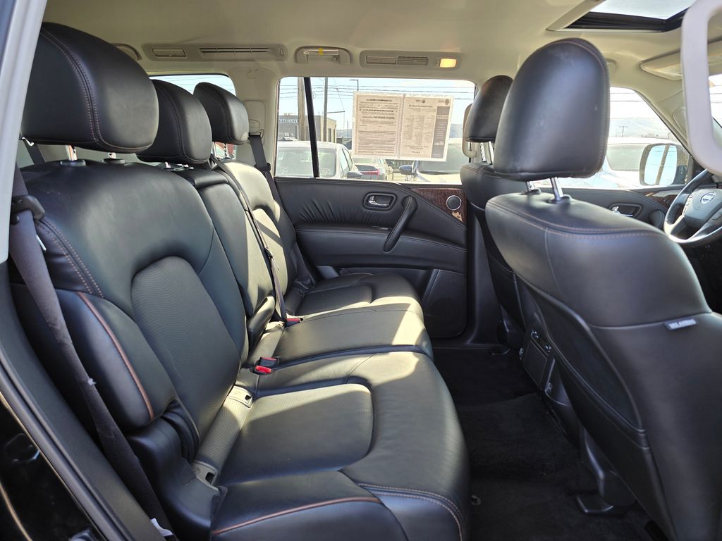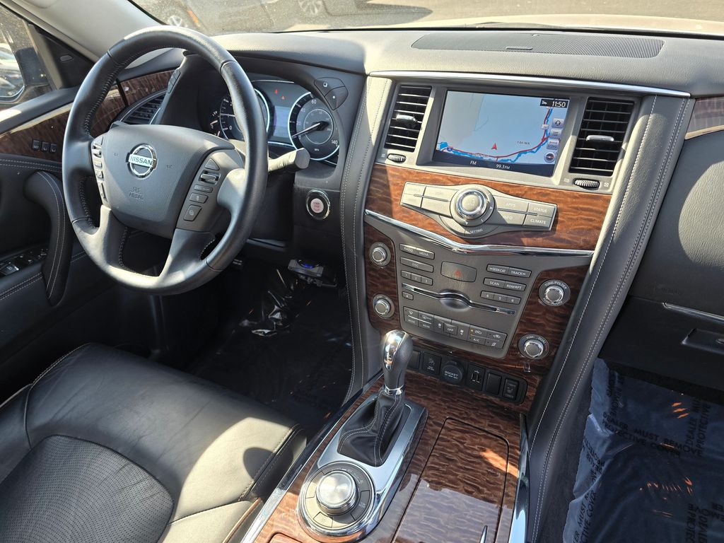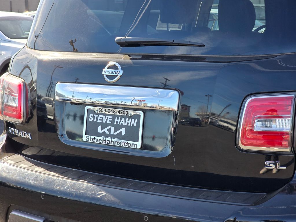 CARFAX One-Owner. Clean CARFAX. Super Black 2019 Nissan Armada SL 5.6L V8 DOHC 32V Endurance 7-Speed Automatic 4WD 4D Sport Utility 4WD, 13 Speakers, 2.937 Axle Ratio, 2nd & 3rd Row Carpeted Mats, 3rd row seats: split-bench, 4-Wheel Disc Brakes, ABS brakes, Air Conditioning, Alloy wheels, AM/FM radio: SiriusXM, Anti-whiplash front head restraints, Auto tilt-away steering wheel, Auto-dimming door mirrors, Auto-dimming Rear-View mirror, Auto-leveling suspension, Automatic temperature control, Blind Spot Warning, Brake assist, Bumpers: body-color, CD player, Cross Bars, Delay-off headlights, Driver door bin, Driver vanity mirror, Dual front impact airbags, Dual front side impact airbags, Electronic Stability Control, Emergency communication system: NissanConnect Services, Four wheel independent suspension, Front anti-roll bar, Front Bucket Seats, Front Center Armrest, Front dual zone A/C, Front fog lights, Front reading lights, Fully automatic headlights, Garage door transmitter: HomeLink, Heated door mirrors, Heated Front Bucket Seats w/Driver Memory, Heated front seats, Illuminated entry, Intelligent Back-Up Intervention (I-BI), Intelligent Distance Control (I-DC), Leather Shift Knob, Leather-Appointed Seat Trim, Low tire pressure warning, Memory seat, Navigation System, Occupant sensing airbag, Outside temperature display, Overhead airbag, Overhead console, Panic alarm, Passenger door bin, Passenger vanity mirror, Power door mirrors, Power driver seat, Power Liftgate, Power passenger seat, Power Sliding Moonroof w/Front Tilt & Rear Slide, Power steering, Power windows, Premium Package, Radio data system, Radio: AM/FM/SXM/CD/MP3/HD, Rain sensing wipers, Rear air conditioning, Rear anti-roll bar, Rear Cross Traffic Alert (RCTA), Rear reading lights, Rear seat center armrest, Rear window defroster, Rear window wiper, Reclining 3rd row seat, Remote keyless entry, Roof rack: rails only, Security system, Speed control, Speed-sensing steering, Speed-Sensitive Wipers, Split folding rear seat, Spoiler, Steering wheel memory, Steering wheel mounted audio controls, Tachometer, Telescoping steering wheel, Tilt steering wheel, Traction control, Trip computer, Turn signal indicator mirrors, Variably intermittent wipers, Voltmeter, Welcome Lighting, Wheels: 20" Machined Finish Painted Alloy, 4WD.