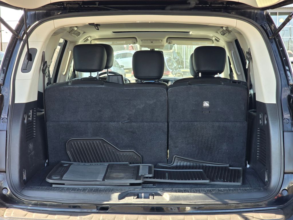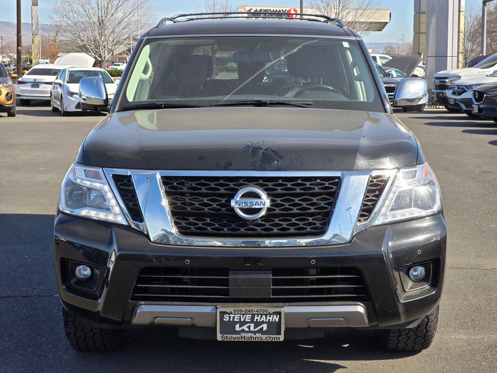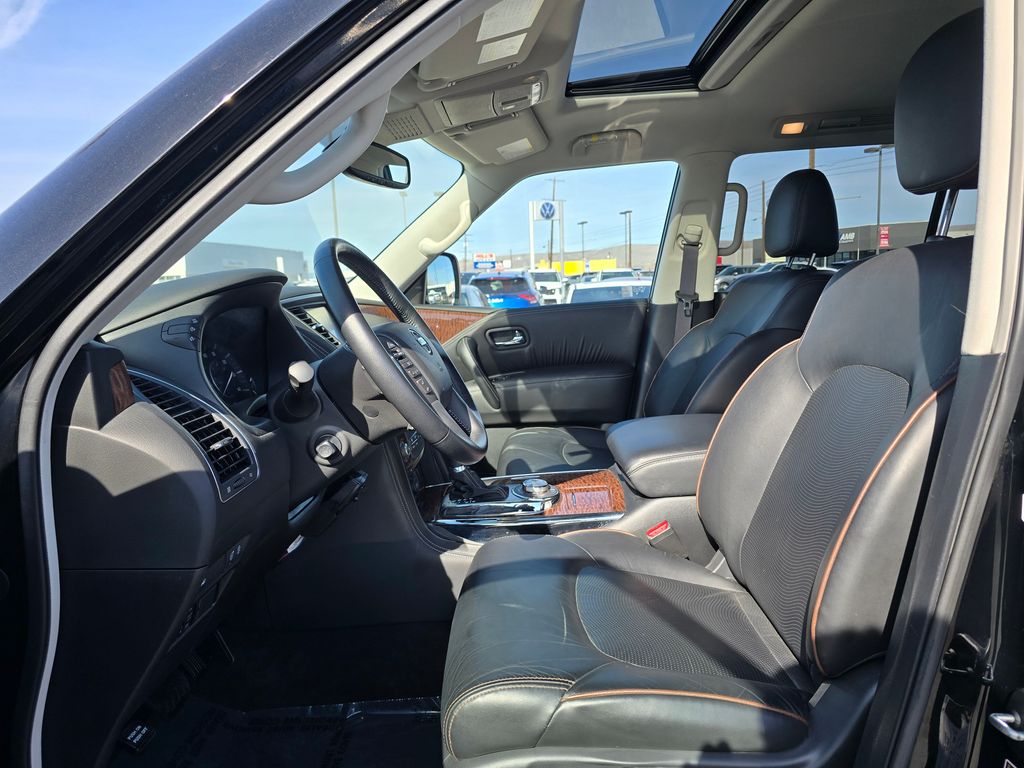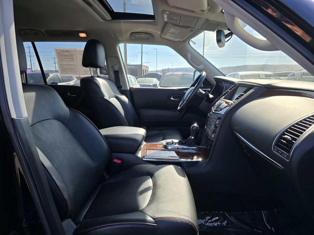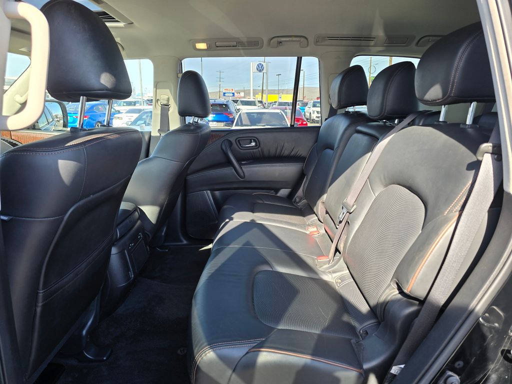 CARFAX One-Owner. Clean CARFAX. Super Black 2019 Nissan Armada SL 5.6L V8 DOHC 32V Endurance 7-Speed Automatic 4WD 4D Sport Utility 4WD, 13 Speakers, 2.937 Axle Ratio, 2nd & 3rd Row Carpeted Mats, 3rd row seats: split-bench, 4-Wheel Disc Brakes, ABS brakes, Air Conditioning, Alloy wheels, AM/FM radio: SiriusXM, Anti-whiplash front head restraints, Auto tilt-away steering wheel, Auto-dimming door mirrors, Auto-dimming Rear-View mirror, Auto-leveling suspension, Automatic temperature control, Blind Spot Warning, Brake assist, Bumpers: body-color, CD player, Cross Bars, Delay-off headlights, Driver door bin, Driver vanity mirror, Dual front impact airbags, Dual front side impact airbags, Electronic Stability Control, Emergency communication system: NissanConnect Services, Four wheel independent suspension, Front anti-roll bar, Front Bucket Seats, Front Center Armrest, Front dual zone A/C, Front fog lights, Front reading lights, Fully automatic headlights, Garage door transmitter: HomeLink, Heated door mirrors, Heated Front Bucket Seats w/Driver Memory, Heated front seats, Illuminated entry, Intelligent Back-Up Intervention (I-BI), Intelligent Distance Control (I-DC), Leather Shift Knob, Leather-Appointed Seat Trim, Low tire pressure warning, Memory seat, Navigation System, Occupant sensing airbag, Outside temperature display, Overhead airbag, Overhead console, Panic alarm, Passenger door bin, Passenger vanity mirror, Power door mirrors, Power driver seat, Power Liftgate, Power passenger seat, Power Sliding Moonroof w/Front Tilt & Rear Slide, Power steering, Power windows, Premium Package, Radio data system, Radio: AM/FM/SXM/CD/MP3/HD, Rain sensing wipers, Rear air conditioning, Rear anti-roll bar, Rear Cross Traffic Alert (RCTA), Rear reading lights, Rear seat center armrest, Rear window defroster, Rear window wiper, Reclining 3rd row seat, Remote keyless entry, Roof rack: rails only, Security system, Speed control, Speed-sensing steering, Speed-Sensitive Wipers, Split folding rear seat, Spoiler, Steering wheel memory, Steering wheel mounted audio controls, Tachometer, Telescoping steering wheel, Tilt steering wheel, Traction control, Trip computer, Turn signal indicator mirrors, Variably intermittent wipers, Voltmeter, Welcome Lighting, Wheels: 20" Machined Finish Painted Alloy, 4WD.