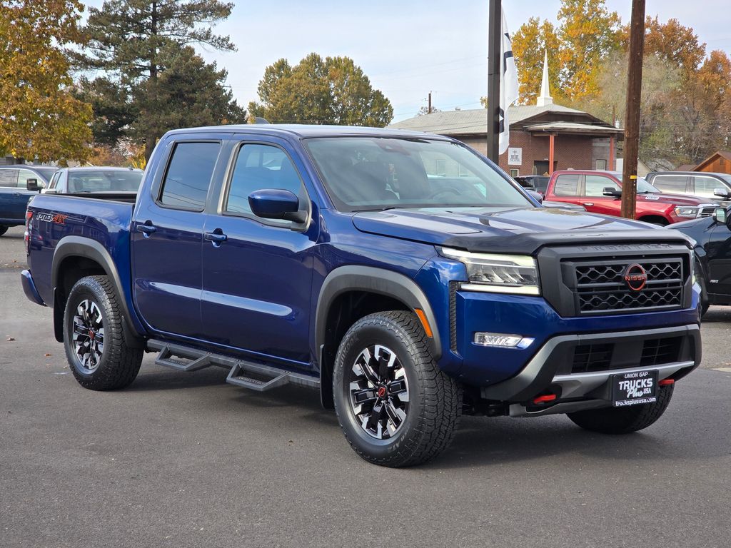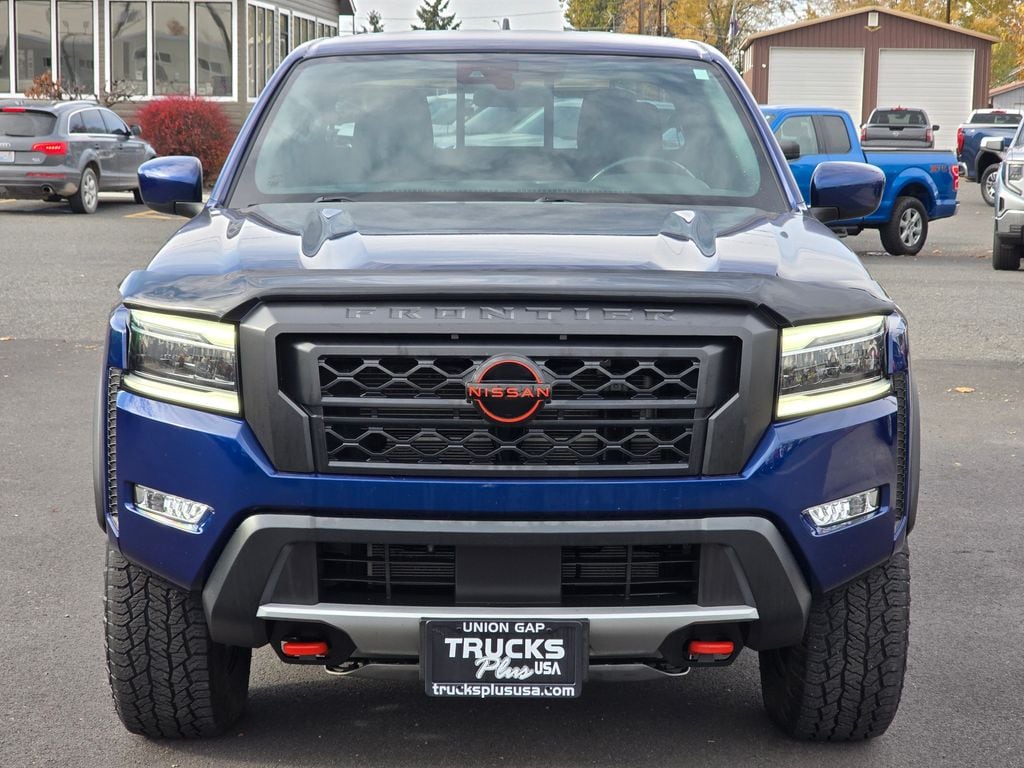 Recent Arrival! Clean CARFAX. Deep Blue Pearl 2022 Nissan Frontier PRO-4X 3.8L DI DOHC 24V V6 9-Speed Automatic 4WD 4D Crew Cab 4WD, 17" Alloy Wheels, 3.692 Axle Ratio, 4-Wheel Disc Brakes, 6 Speakers, ABS brakes, Air Conditioning, Alloy wheels, AM/FM radio: SiriusXM, Anti-whiplash front head restraints, Auto High-beam Headlights, Automatic temperature control, Brake assist, Bumpers: body-color, Delay-off headlights, Driver door bin, Driver vanity mirror, Dual front impact airbags, Dual front side impact airbags, Electronic Stability Control, Emergency communication system: NissanConnect Services, Front anti-roll bar, Front Bucket Seats, Front Center Armrest, Front dual zone A/C, Front fog lights, Front reading lights, Front wheel independent suspension, Fully automatic headlights, Illuminated entry, Knee airbag, Leather Shift Knob, Low tire pressure warning, Navigation system: Nissan Navigation with Voice Recognition, Occupant sensing airbag, Off-Road Protection Package, Off-Road Style Step Rails, Overhead airbag, Overhead console, Panic alarm, Passenger door bin, Passenger vanity mirror, Power door mirrors, Power driver seat, Power steering, Power windows, PRO Embroidered Premium Cloth Seat Trim, PRO-4X Mud Flaps, Radio data system, Radio: SXM/AM/FM/AUX/USB Audio System w/6 Speakers, Rear anti-roll bar, Rear seat center armrest, Rear step bumper, Remote Engine Start, Remote keyless entry, Security system, Speed control, Speed-sensing steering, Split folding rear seat, Steering wheel mounted audio controls, Tachometer, Tilt steering wheel, Traction control, Trip computer, Variably intermittent wipers, Voltmeter, 4WD.