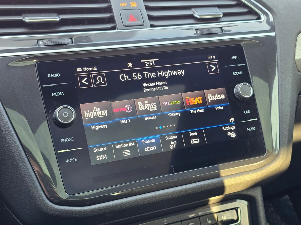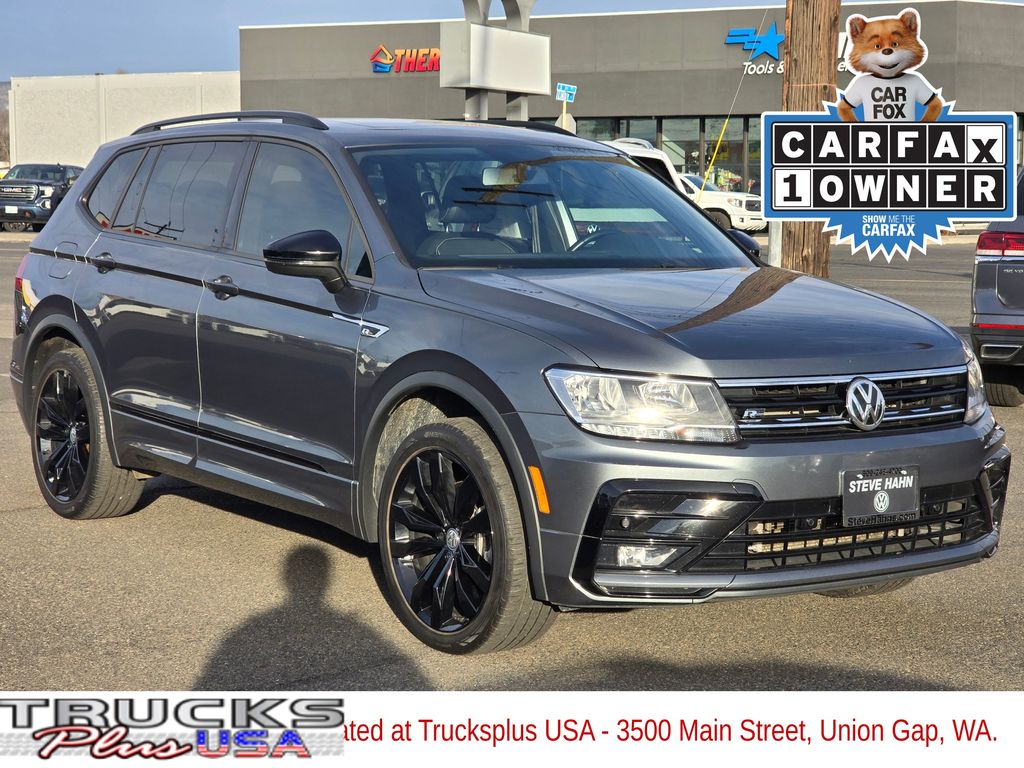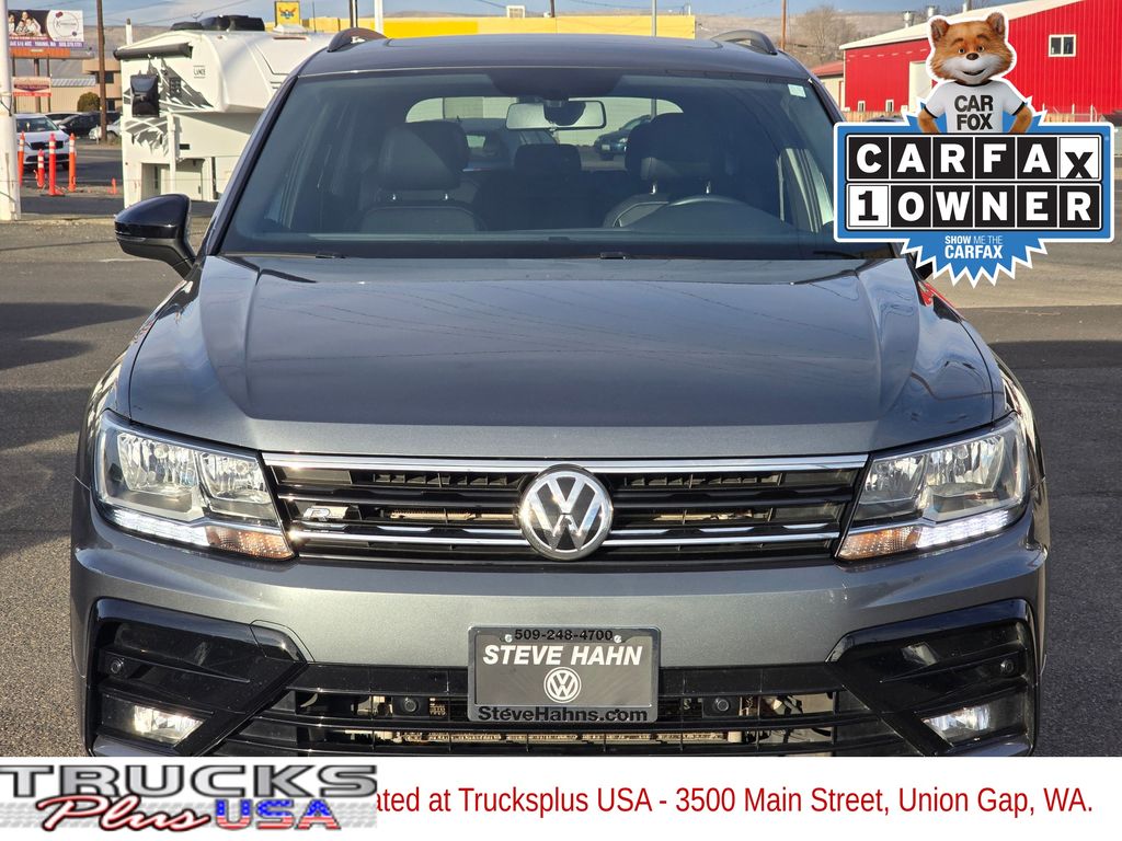 CARFAX One-Owner. Clean CARFAX. Platinum Gray Metallic 2021 Volkswagen Tiguan 2.0T SE R-Line Black 2.0L TSI DOHC 8-Speed Automatic with Tiptronic AWD 4D Sport Utility AWD, 2-Row Rubber Monster Mats w/Logo Kit (Set of 4), 3.33 Axle Ratio, 4-Wheel Disc Brakes, 4-Wheel Independent Suspension, 6 Speakers, ABS brakes, Air Conditioning, Alloy wheels, AM/FM radio: SiriusXM with 360L, Automatic temperature control, Brake assist, Bumpers: body-color, Cargo Area Retractable Privacy Cover, Compass, Delay-off headlights, Driver door bin, Driver vanity mirror, Dual front impact airbags, Dual front side impact airbags, Electronic Stability Control, Emergency communication system: VW Car-Net services (capabilities require enrollment or subscription), Exterior Parking Camera Rear, First Aid Kit, Forward collision: FCW w/Autonomous Emergency Braking mitigation, Four wheel independent suspension, Front anti-roll bar, Front Bucket Seats, Front Center Armrest, Front dual zone A/C, Front fog lights, Front reading lights, Fully automatic headlights, Heated door mirrors, Heated Front Comfort Seats, Heated front seats, Heavy Duty Trunk Liner w/VW CarGo Blocks, Illuminated entry, Leather Shift Knob, Leather steering wheel, Low tire pressure warning, Occupant sensing airbag, Outside temperature display, Overhead airbag, Overhead console, Panic alarm, Passenger door bin, Passenger vanity mirror, Perforated V-Tex Leatherette Seating Surfaces, Power door mirrors, Power driver seat, Power moonroof, Power steering, Power windows, Radio data system, Radio: MIB3 Composition Media AM/FM/HD, Rear anti-roll bar, Rear reading lights, Rear seat center armrest, Rear window defroster, Rear window wiper, Remote keyless entry, Roadside Assistance Kit, Roof rack: rails only, Security system, Speed control, Speed-sensing steering, Split folding rear seat, Spoiler, Sport steering wheel, Steering wheel mounted audio controls, Tachometer, Telescoping steering wheel, Tilt steering wheel, Traction control, Trip computer, Turn signal indicator mirrors, Variably intermittent wipers, Wheels: 20" Machined Black Alloy, AWD.